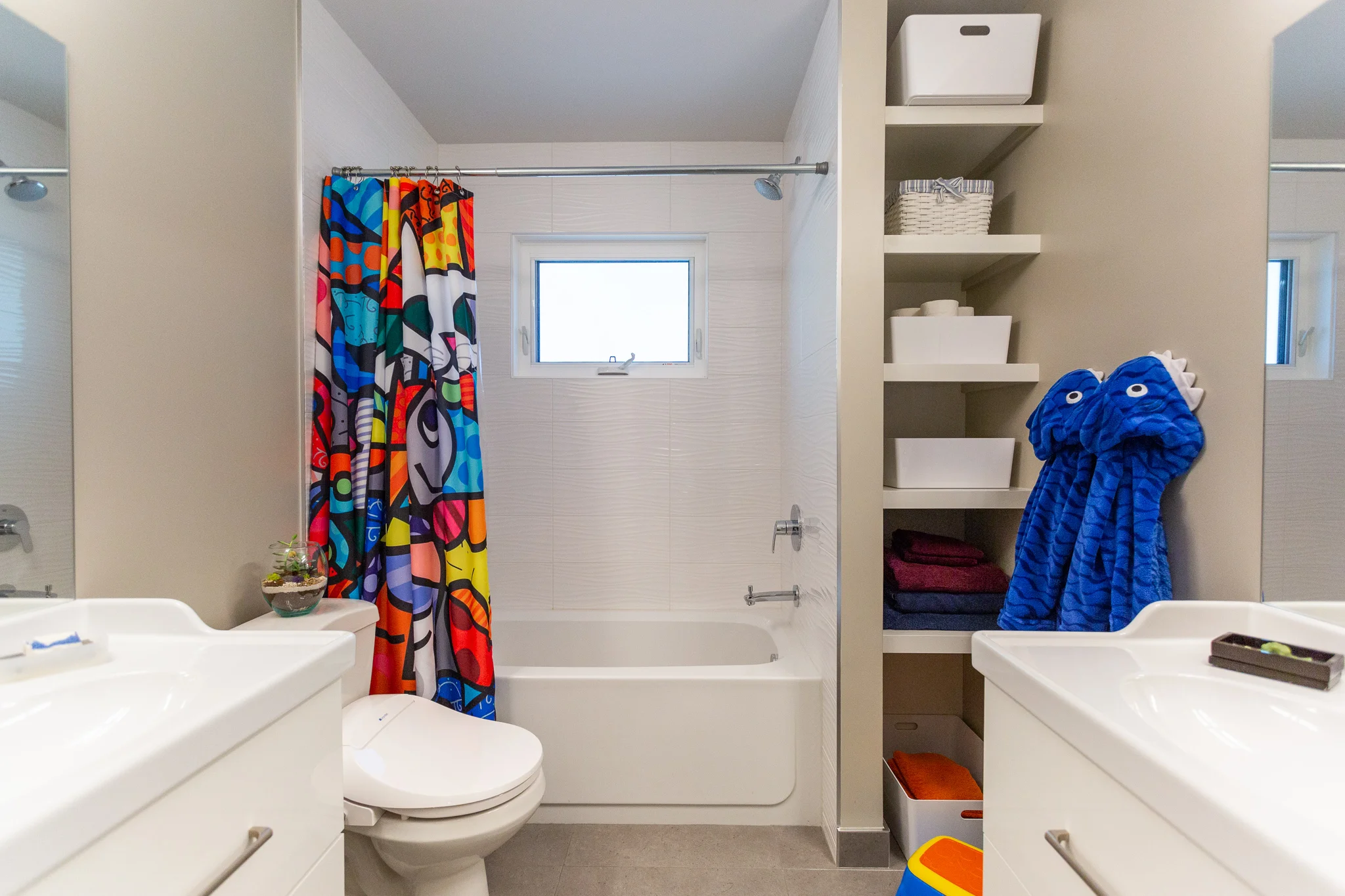 Functional storage, efficient work areas and large counter spaces were at the top of the clients’ wish list. The second renovation aimed to improve the master bathroom and closet, as well as the kids’ bathroom spaces. New floor plans were developed and the decision to use Ikea cabinetry helped with the budget. For both renovations, interesting textures provided by features such as soapstone counters and custom cut porcelain tiles—coupled with joyful little pops of colour—gave this home the character the clients’ were looking for.